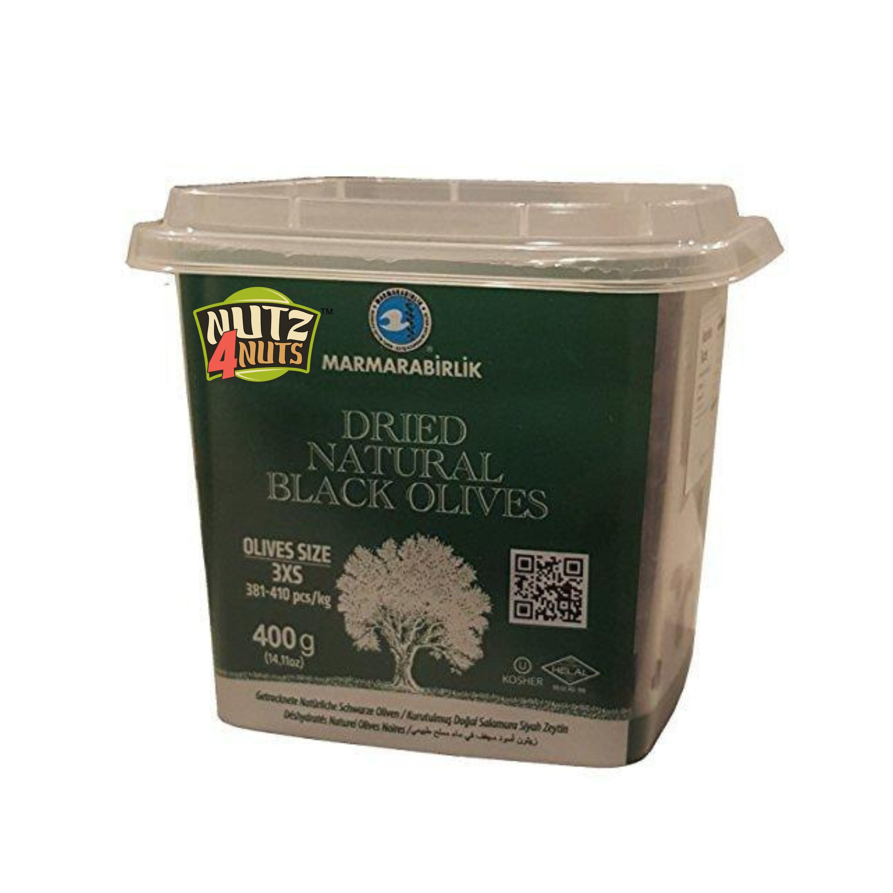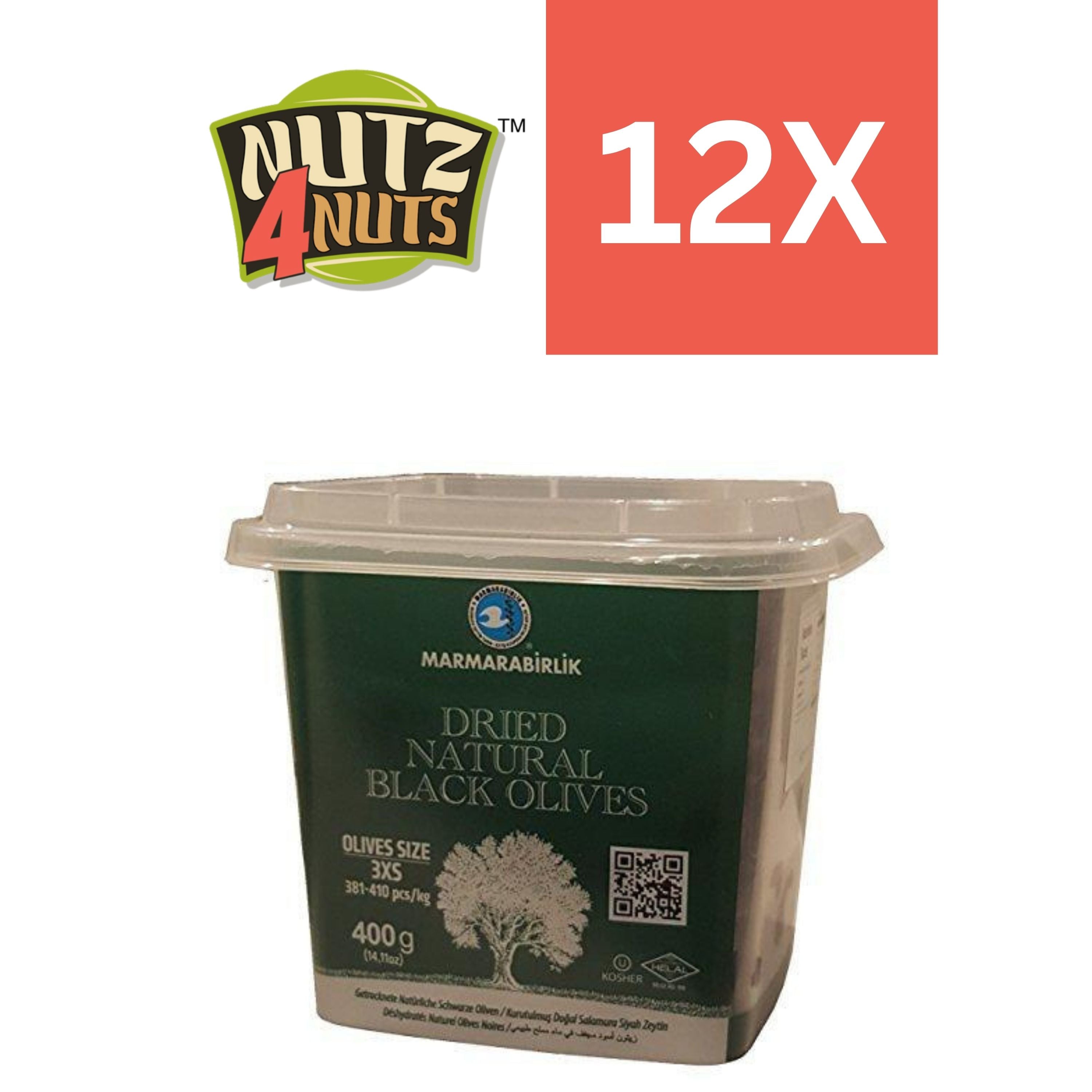 Marmara Birlik Turkish Dry Cured Natural Black Olives, 3XS, 12X400g